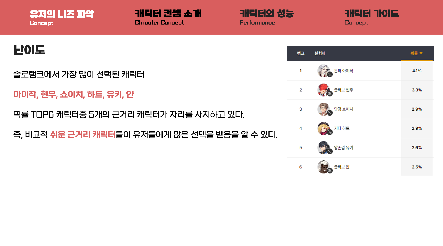 따라서 기획할 캐릭터는 픽률 TOP6 근거리 캐릭터들과는 차별화된 매력과 플레이 경험을 제공하며,