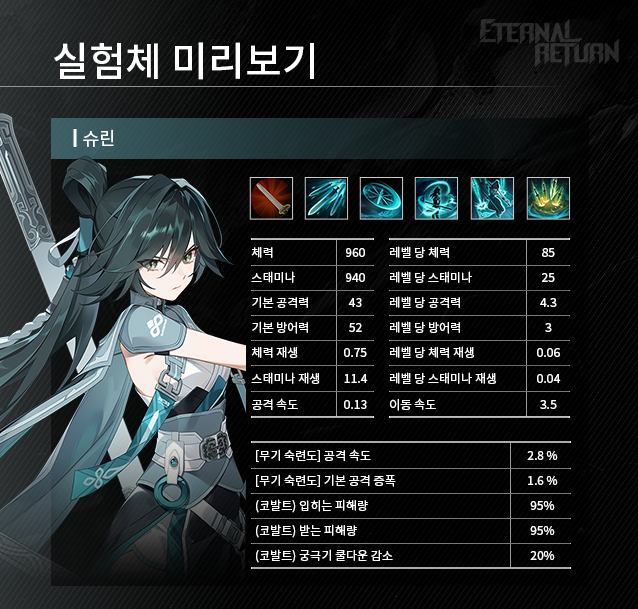 슈린의 상세 데이터와 스탯은 다른 근접 실험체에 비해 다소 낮다고 볼 수 있네요.